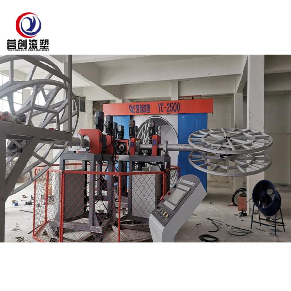 The Roto Moulding Machine manufactured by Yingchuang is made in Changzhou city, Jiangsu province and is certified with CE and ISO9001. The minimum order quantity is 1 set and it is packaged in wooden box with wrapping film. The delivery time is 30 work days and payment terms include L/C, T/T, Western Union. The supply ability is 10 sets/month. This machine can be cooled by air/water and heated by electricity, and is suitable for making tanks with aluminum, plastic, etc. The oven size ranges from 500*500mm, 1000*1000mm to 1600*1600mm.
